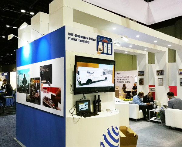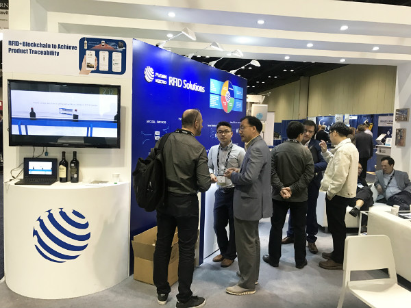 同時,結合產品的實際應用場景,展臺也進行了案例演示。觀眾對我司卓越穩定的產品性能和綜合應用解決方案有了全方位的了解。在跨境商品防偽溯源領域,我司展示了將PUF(物理不可克?。┓纻喂δ艿腞FID標簽與區塊鏈結合的創新方案。參觀者在現場通過NFC手機掃描貼在產自加州納帕谷酒莊的紅酒上的RFID標簽,就能接收到該酒的認證信息,了解該酒的特點及完整的物流信息。據悉,這是全球首例將RFID與區塊鏈結合應用于跨境商品流通的真實案例。